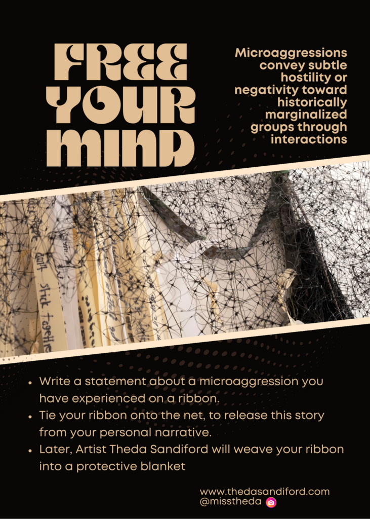 Free Your Mind is a public textile art endeavor with the objective of gathering, showcasing, embedding, and liberating personal narratives surrounding microaggressions through a multi-sensory installation.