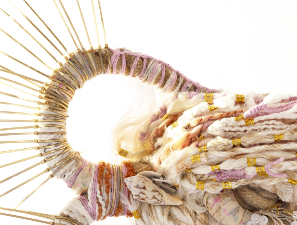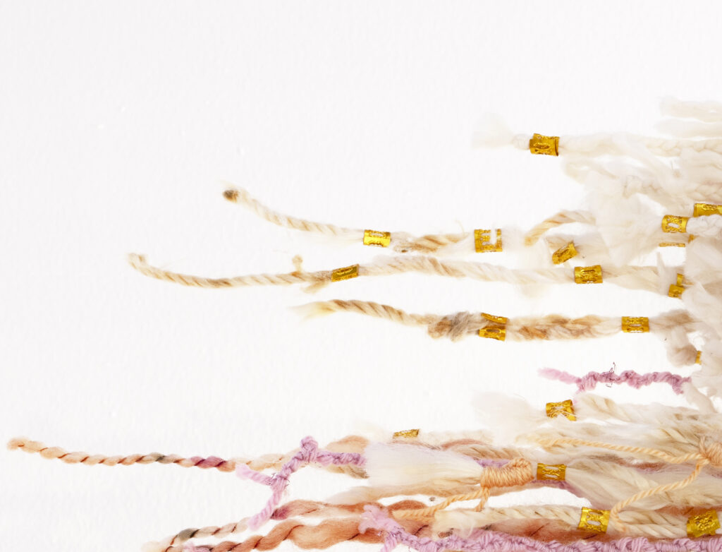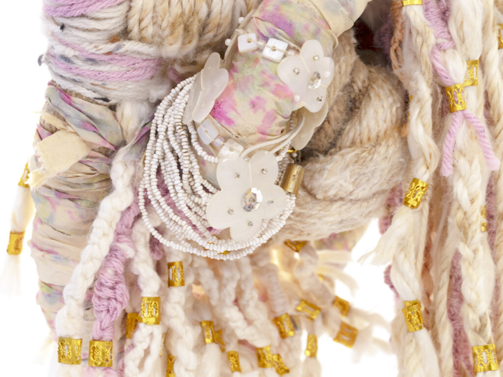 Recycling and repurposing are central to my practice. Nearly everything I use has already lived a life: clothing worn by friends and family, discarded marine debris, overlooked materials deemed broken or expendable. These materials are transformed into rope, vessels, and sculptural forms that merge the personal with the collective. In this process, I engage in shadow work, addressing what has been marginalized, silenced, or rendered invisible by colonial systems. Natural hairstyles like braids and locs, long questioned in white spaces for their “respectability” or professionalism, become both material and metaphor, sites of resistance, pride, and embodied history.