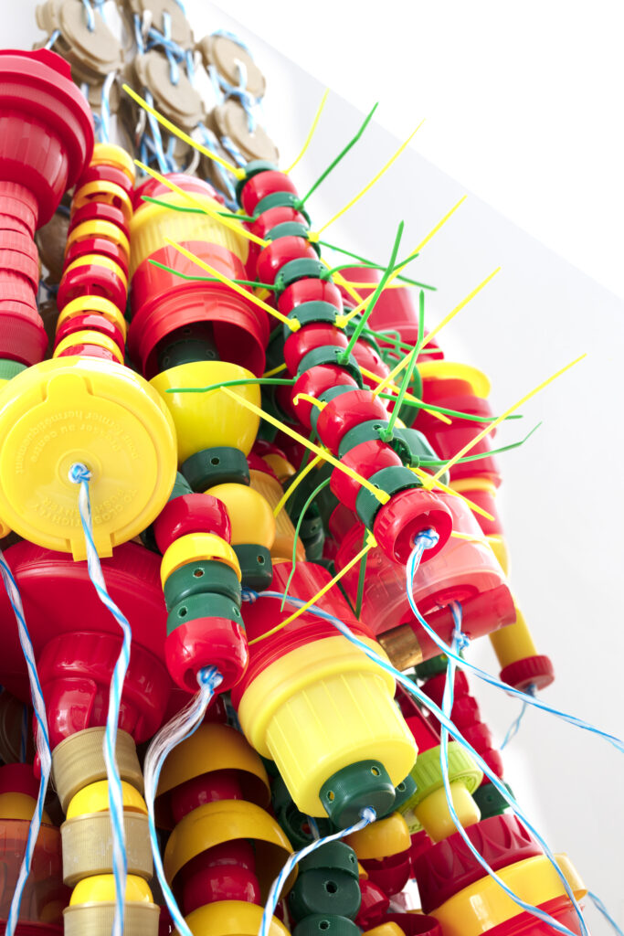 I’ve been stringing/weaving bottle caps onto cord to make braids… which will then be strung with neon paracord…