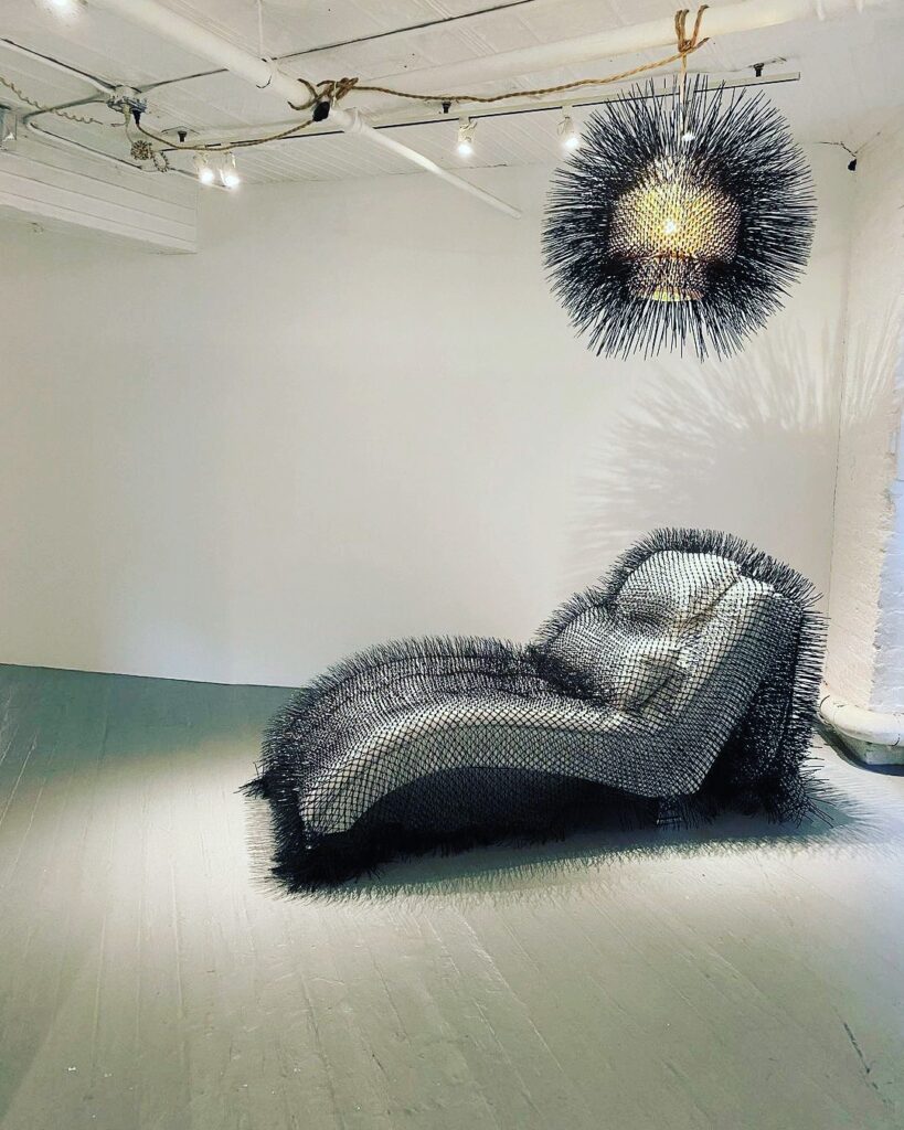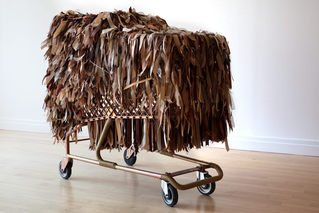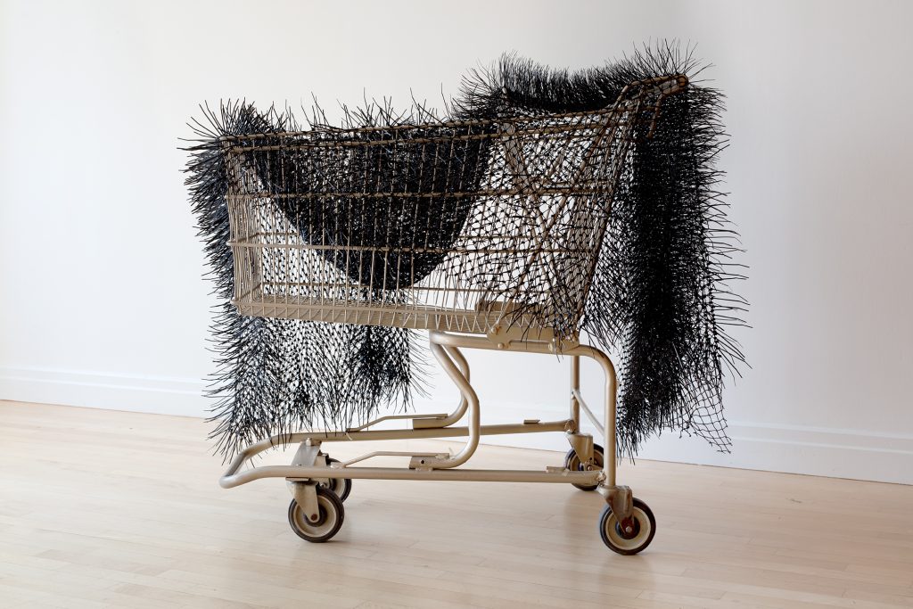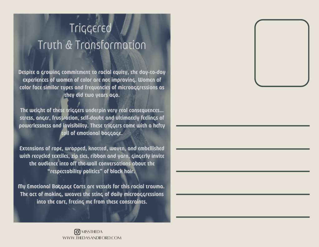 Extensions of rope, wrapped, knotted, woven, and embellished with recycled textiles, zip ties, ribbon and yarn, gingerly invite the audience into off the-wall conversations about the “respectability politics” of black hair. My Emotional Baggage Carts are vessels for this racial trauma. The act of making, weaves the sting of daily microaggressions into the cart, freeing me from these constraints.