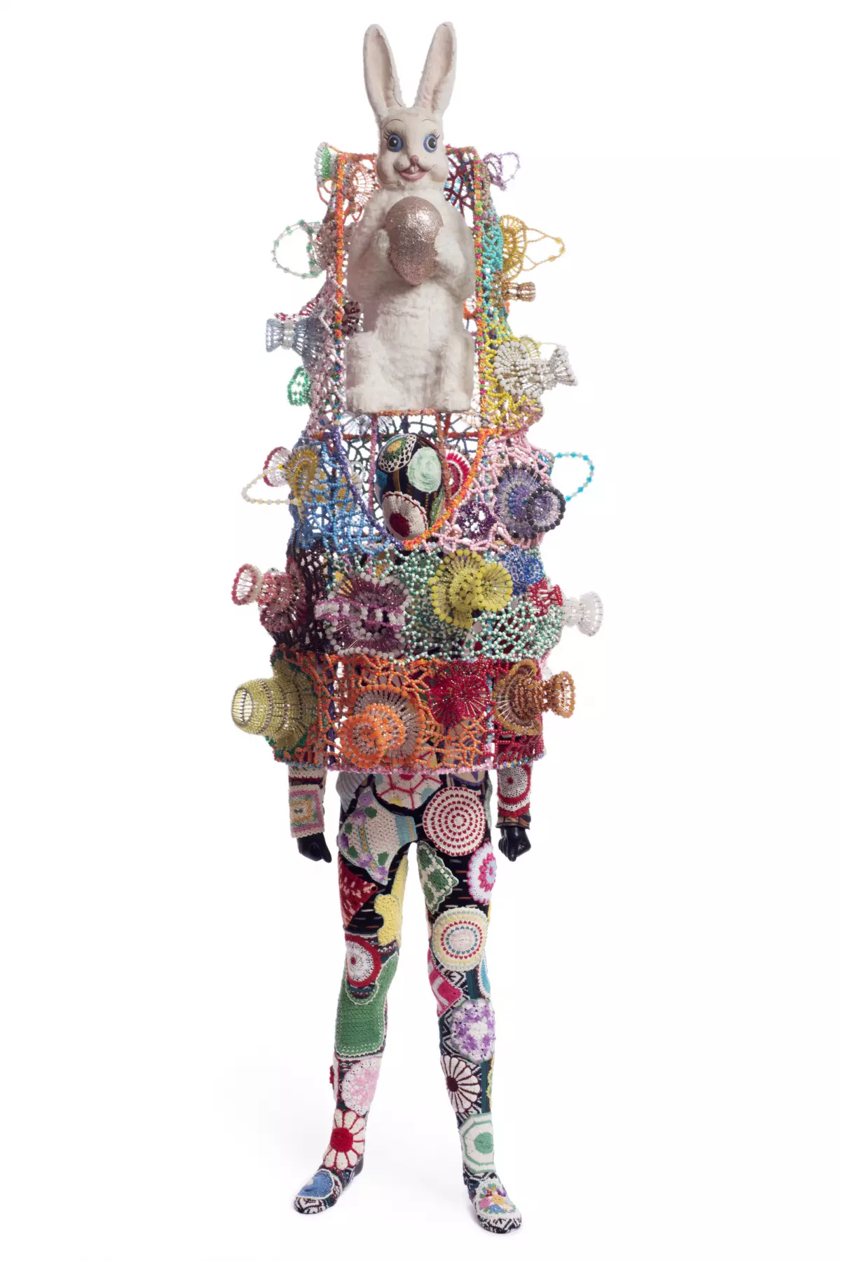 Vintage Gi Joe action figures, black metallic yarn, handmade eyelash yarn, black and brown cotton/rayon poly blend fabric, African printed fabric, vintage African fabric wrapped on recycled polyurethane spliced jungle gym rope netting.