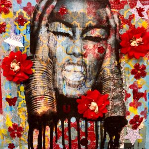 Medium: Acrylic paint, Xerox image transfers, stencil printed deli, paper, paper punched recycled envelops, tissue paper, buttons, glitter appliqués, glitter, Diamond Dust on canvas.