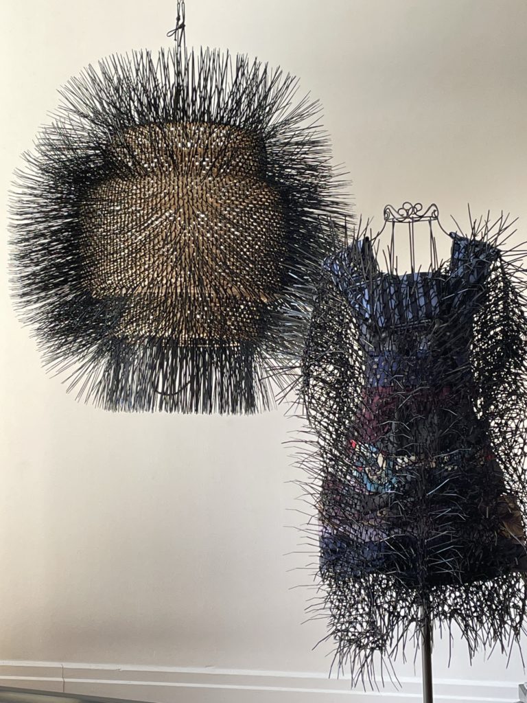 What happens when vintage silk ties and woven onto a metal dress form and adorned with a zip tie blanket tunic… protection from the patriarchy.