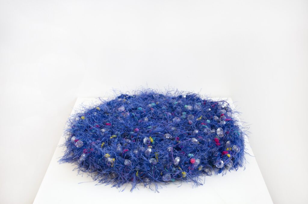 This artwork, crafted from three-ply cotton glitter rope, intricately knotted and wrapped with eyelash yarn, embroidery floss, and crystal beads, forms the foundational layer of a spiritual altar. Designed to harmonize with feathers, shells, and a bowl of water, it amplifies elemental energies to create a sacred space for reflection, connection, and renewal.