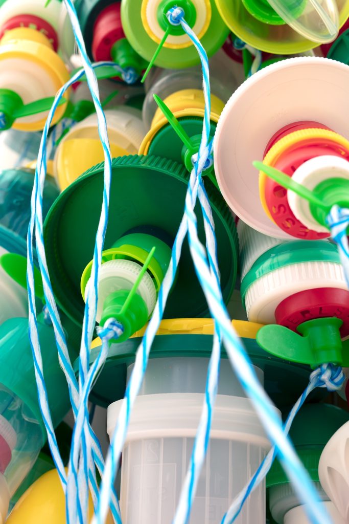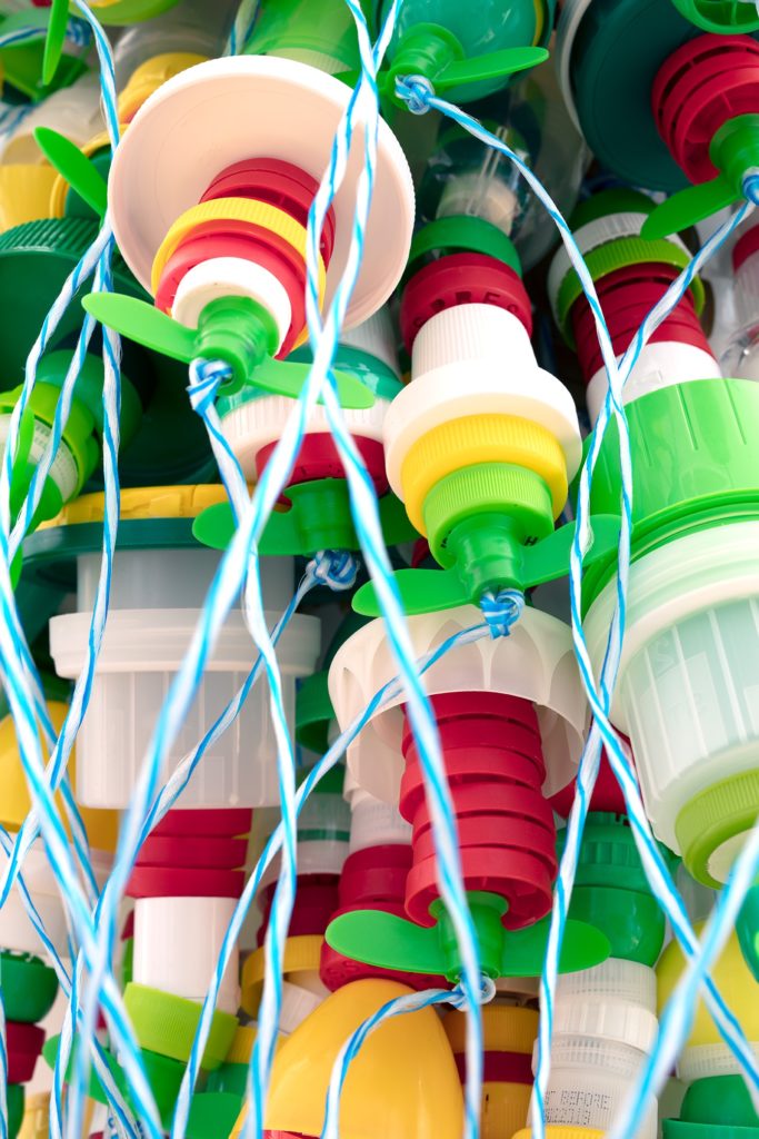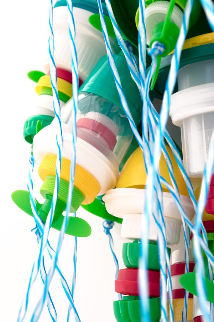 Cider Six Packs and various single use bottle caps strung and knotted with blue and white polyurethane rope.